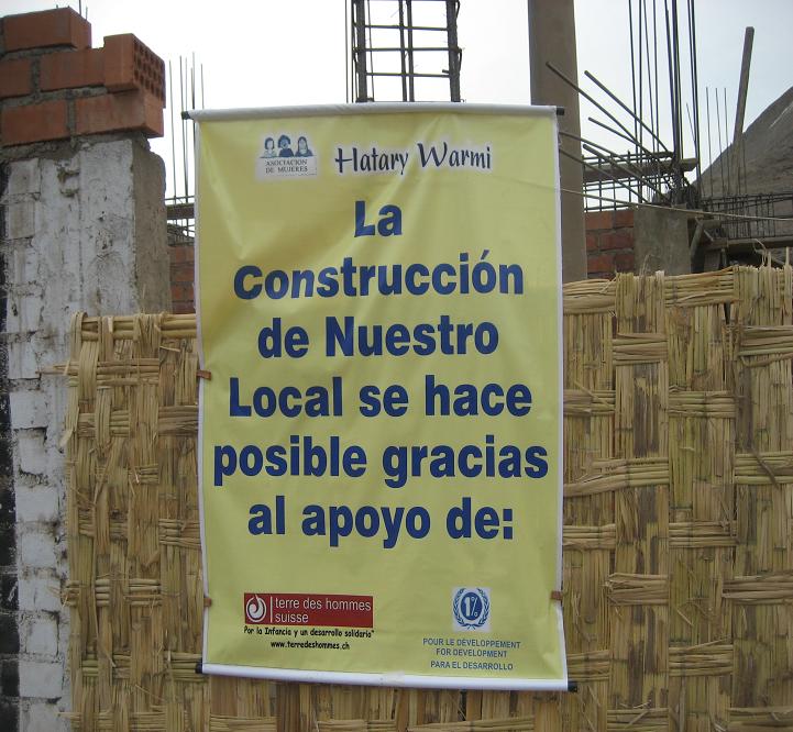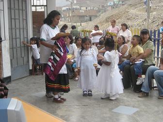 Il nous aura fallu plus de trois heures dans la poussière et les embouteillages chaotiques de la veille de Noël pour aller de Villa Salvador aux Laderas de Chillon au nord de Lima. Là aussi nous pénétrons dans une école garderie d'un quartier très difficile et dangereux de la banlieue de Lima ; ici c'est le dernier jour d'école et nous arrivons en pleine fête des enfants ; l'Association Hatamy Warmi (« Femme, lève-toi! ») qui dirige le centre d'accueil a réuni les parents (essentiellement les mères) et les enfants pour une double fête d'adieu. Adieu d'abord aux enfants qui partent en vacances et adieu au bâtiment de l'école puisque celle-ci devrait être déplacée 800 mètres plus loin dans le même quartier. Lorsque nous arrivons nous sommes accueillis par un tonnerre d'applaudissements et la présidente, Martha, interrompt la manifestation pour nous présenter et nous remercier de l'aide que Terre des Hommes et le Fonds 1% ont apporté à la réalisation du projet en cours : la construction d'un nouveau bâtiment de l'école de l'autre côté du quartier qui sera plus vaste mais surtout dont l'Association Hatamy Warmi sera propriétaire.